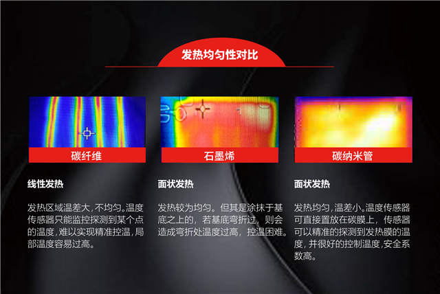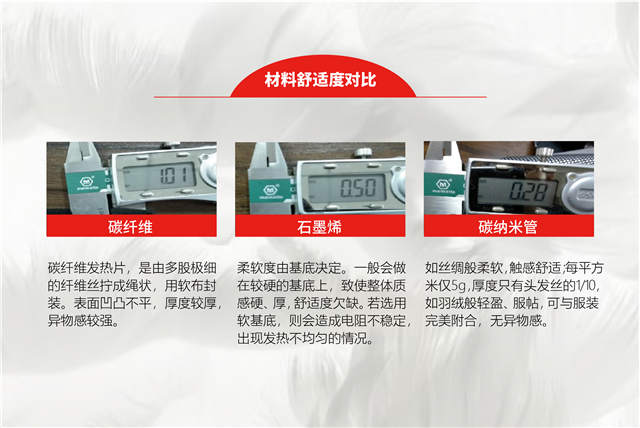 由于服裝產(chǎn)品對水洗、彎折、舒適性,均有一定的要求,經(jīng)過測試對比,碳納米管加熱材料更適合在服裝穿戴領(lǐng)域中應(yīng)用。