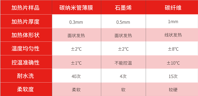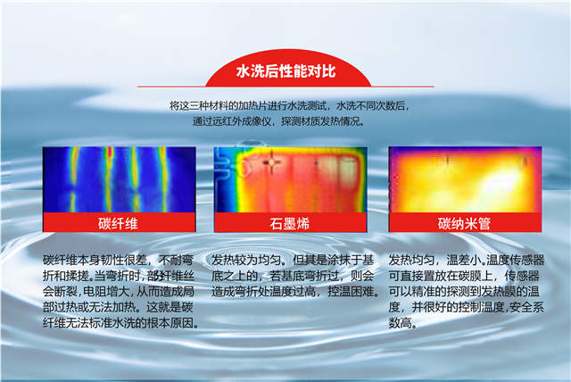 經(jīng)過水洗測試數(shù)據(jù)顯示:石墨烯加熱片,可支持標(biāo)準(zhǔn)水洗10次左右;碳纖維加熱片支持10-20次標(biāo)準(zhǔn)水洗;而碳納米管加熱片(薄膜)在標(biāo)準(zhǔn)水洗40次后,性能依舊穩(wěn)定。