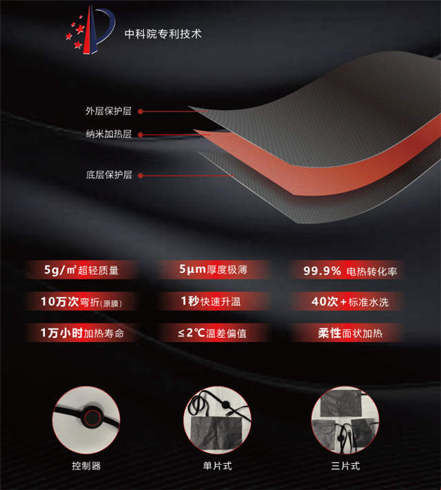 碳納米管具有非常大的長徑比,使其可以自組裝形成網(wǎng)絡(luò)結(jié)構(gòu)的薄膜,而不需要任何基底的支撐,自支撐的結(jié)構(gòu)使碳納米管薄膜具備非常好的柔性,并兼顧非常好的力學(xué)強(qiáng)度,可以任意彎折并保持穩(wěn)定的結(jié)構(gòu)和電學(xué)性能。后期僅需在薄膜兩端加電壓,用軟布封裝,即可通電發(fā)熱。
