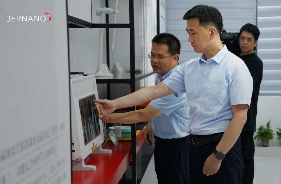 在公司董事長(zhǎng)梁青、副總經(jīng)理金赫華的帶領(lǐng)下,市長(zhǎng)蔡劍峰一行先后參觀了碳納米管薄膜(下文簡(jiǎn)稱“碳膜”)材料及產(chǎn)品展廳、碳膜生產(chǎn)車間、加熱產(chǎn)品生產(chǎn)線,認(rèn)真聽取了梁青董事長(zhǎng)關(guān)于捷迪在碳膜產(chǎn)品應(yīng)用介紹,并針對(duì)捷迪目前取得的研發(fā)成果及市場(chǎng)成績(jī)做出核心交流。